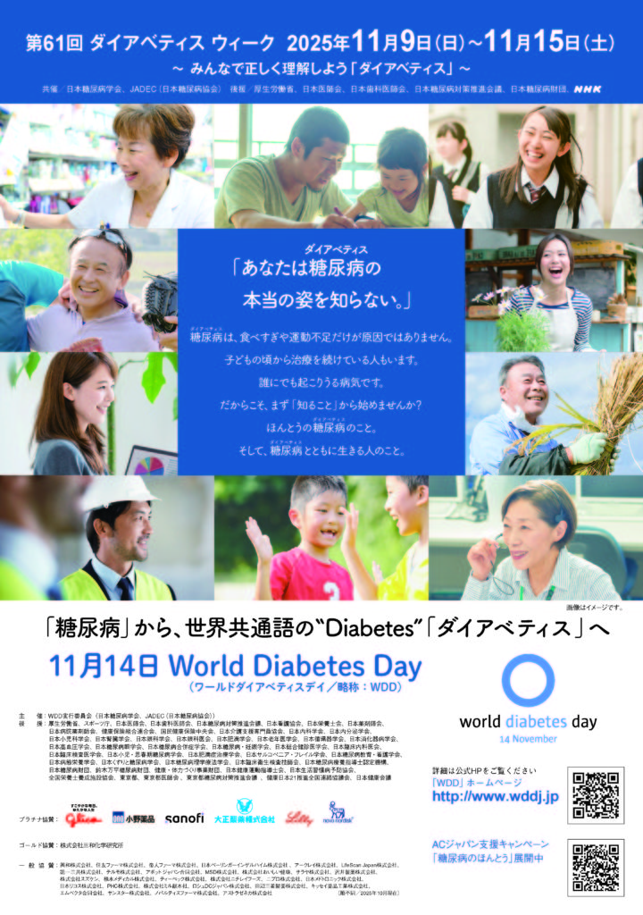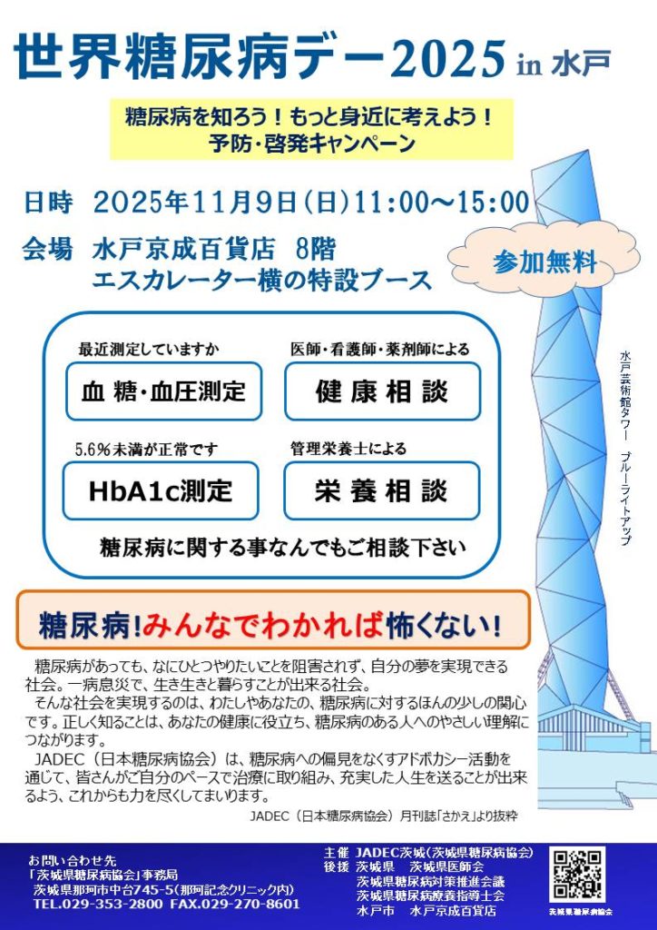 JADEC(日本糖尿病協会)では、毎年11月14日を含む1週間をダイアベティスウィークとして全国各地で一般向けの講演会や健康相談、街頭での広報活動などを実施しています。茨城県では11月13日(木)~16日(日)に水戸市芸術館アートタワーをブルーライトアップします。また11月9日(日)には水戸市とつくば市でイベントを行いますので是非ご参加ください。